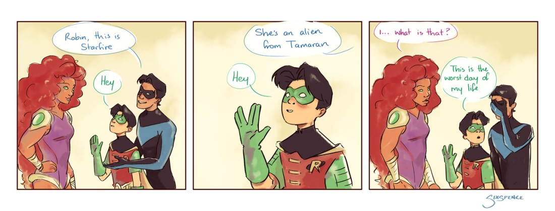 Spoiler: *swings in from a nearby rooftop* Is he here? Did he buy – Oh, hey, Jay! Starfire’s giggling her orange-y, little head off watching you right now. *points to a hidden camera in a crevice*