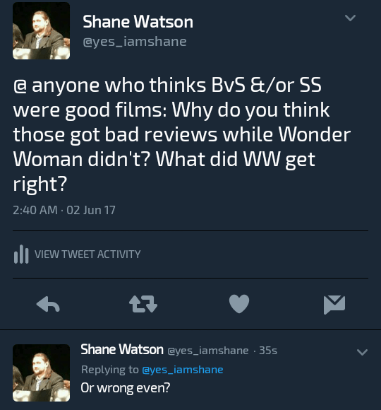 Also the complete lack of understanding about long term story development. MoS and BvS were about the plot developing naturally into something more light. It starts with Superman feeling alone and isolate, leads into the struggle of heroes finding their direction in BvS (mostly Batman and Wonder Woman, whilst giving Superman the chance to return to a world that better understands and trusts him). SS served to show that there are other threats out there, and show what a world without the Justice League could potentially be like. And Wonder Woman comes along, and it’s set outside of that development for the nosy part, but lays out a clear blueprint about who Diana is and why she doe what she does.